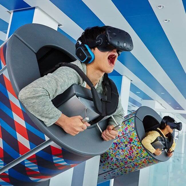 The shooting VR game wasn’t amazing although it does have some cool effects. Better was the Tokyo Bullet Flight where you get into a cylinder and fly over the city. The Swing Coaster is also popular.